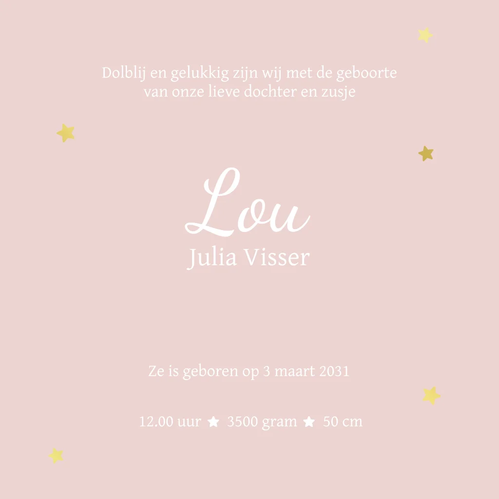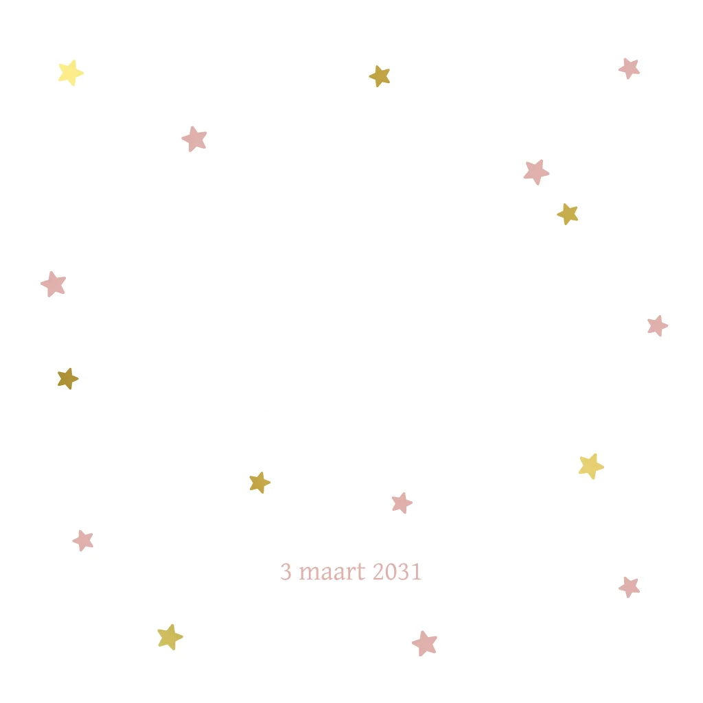 Een lief en bijzonder geboortekaartje met een doorkijk in de vorm van een wolk aan de voorzijde waardoor je de naam van de kleine aan de binnenkant kan zien. De wolk heeft de achtergrondkleur die je aan de binnenzijde terug ziet komen. Deze kleur is in de editor nog makkelijk te wijzigen naar elke andere kleur. Om de wolk heen aan de voorzijde zie je veel kleine sterren in de kleuren roze en goud foliedruk. Onder de wolk staat de geboortedatum op de voorzijde van het kaartje. De doorkijk in de vorm van een wolk maakt dit kaartje extra speciaal. Een leuke keuze om de geboorte van jou\jullie dochter mee aan te kondigen.