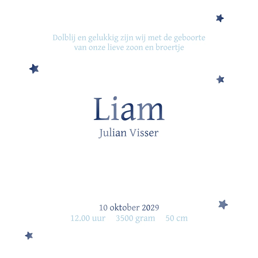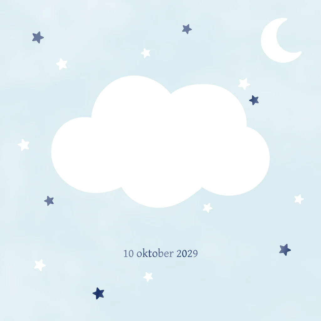 Een lief geboortekaartje met een aantal sterren en tekst gedrukt in hoogglans wat de kaart extra speciaal maakt. Op de voorzijde van de kaart is de wolk een doorkijk waardoor je de naam van de baby aan de binnenkant kan zien.
