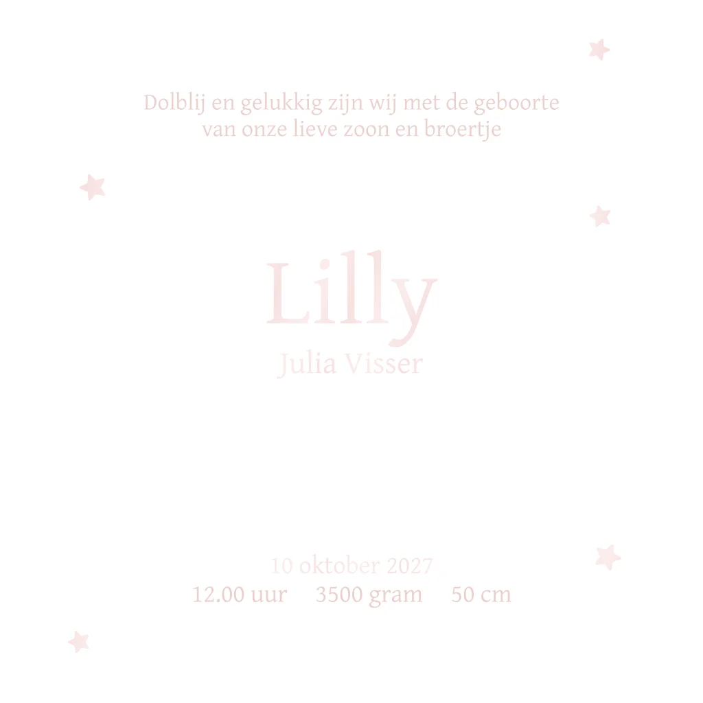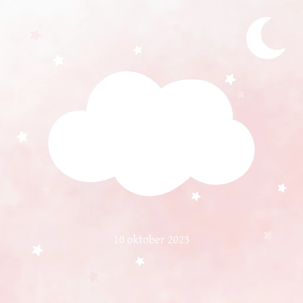 Een lief geboortekaartje met een aantal sterren en tekst gedrukt in hoogglans wat de kaart extra speciaal maakt. Op de voorzijde van de kaart is de wolk een doorkijk waardoor je de naam van de kleine aan de binnenkant kan zien.