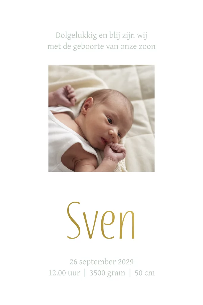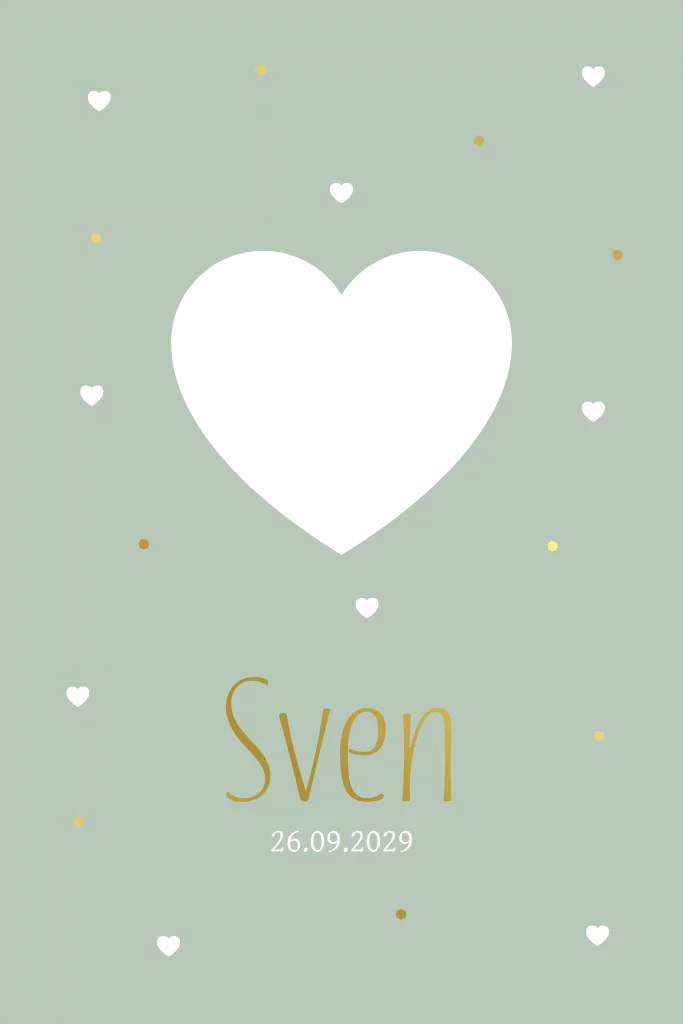 Een lief geboortekaartje met op de voorzijde een doorkijk in de vorm van een hartje. Aan de binnenzijde kan je een foto van de baby plaatsen. Op de voorzijde is ook gebruik gemaakt van foliedruk zodat de kaart een extra wauw effect heeft.