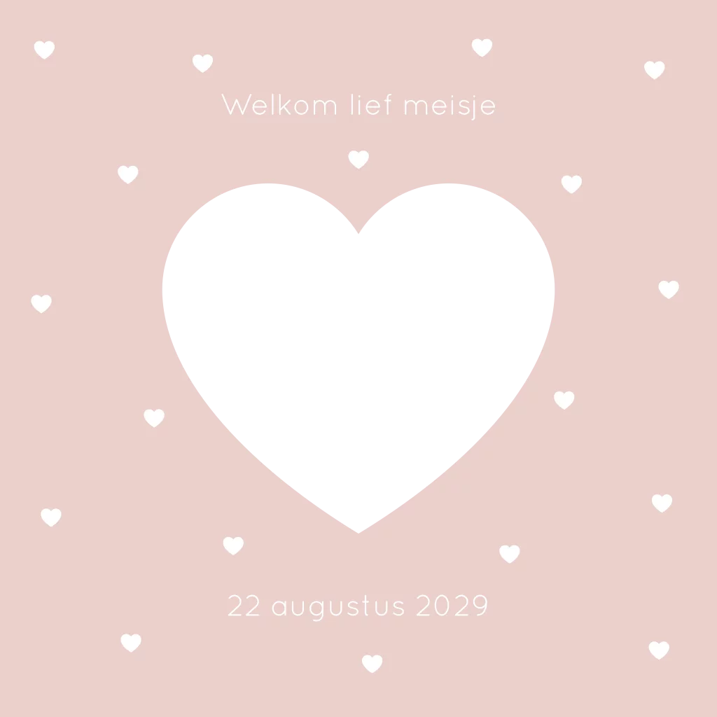 Een lief roze geboortekaartje met op de voorzijde allemaal kleine witte hartjes. In het grote hart op de voorzijde is de naam te zien die aan de binnenzijde van de kaart staat.