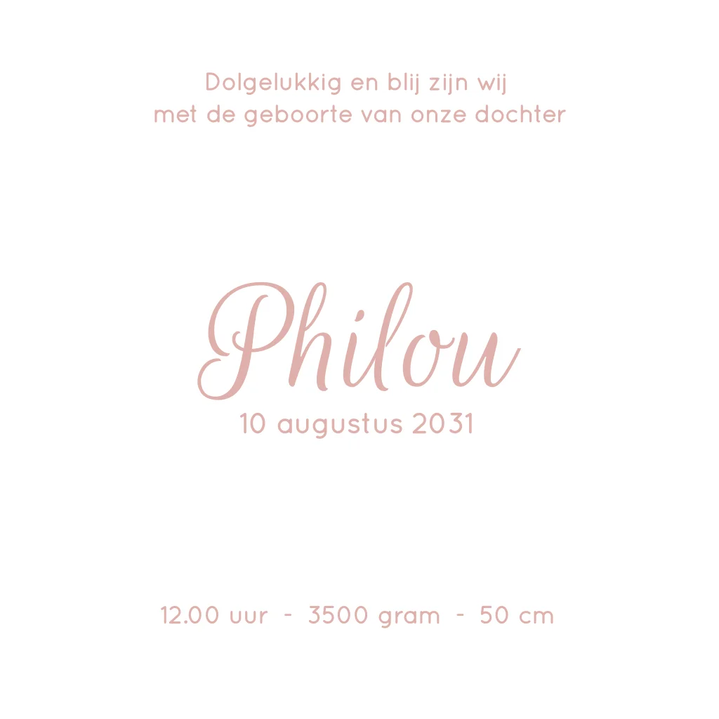 Een lief en origineel geboortekaartje met een roze achtergrond. Door het witte bloemenpatroon krijgt het geboortekaartje een romantische look. De doorkijk in het midden maakt dit geboortekaartje extra bijzonder. In de doorkijk zie je de voorbeeldnaam Philou met daaronder de geboortedatum. Een heel lief geboortekaartje voor de geboorte van een meisje.