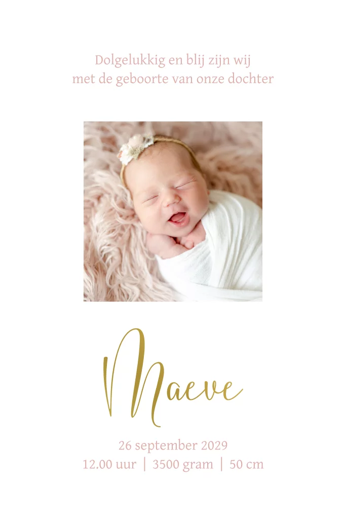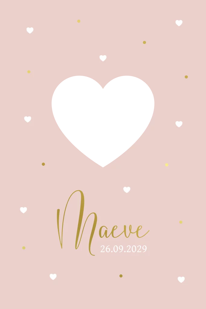 Een lief geboortekaartje met op de voorzijde een doorkijk in de vorm van een hartje. Aan de binnenzijde kan je een foto van de baby plaatsen. Op de voorzijde is ook gebruik gemaakt van foliedruk zodat de kaart een extra wauw effect heeft.
