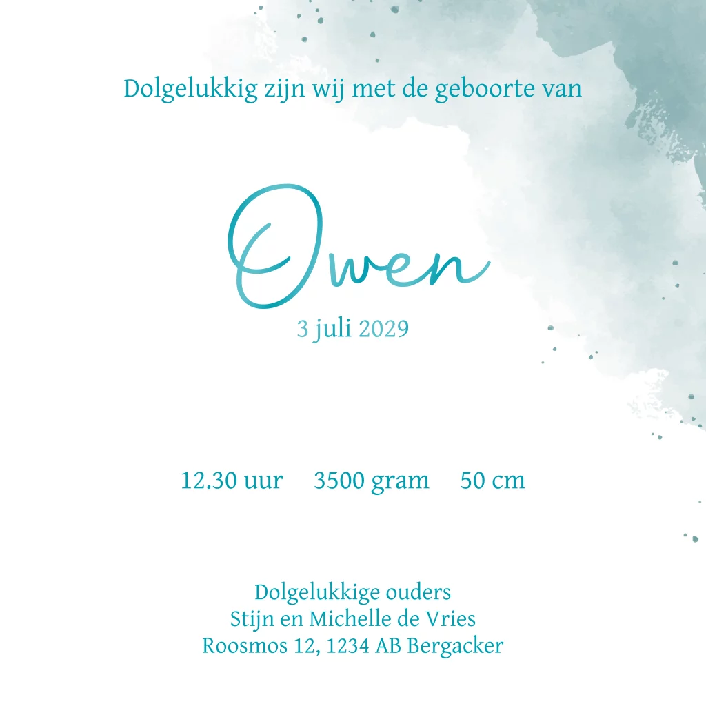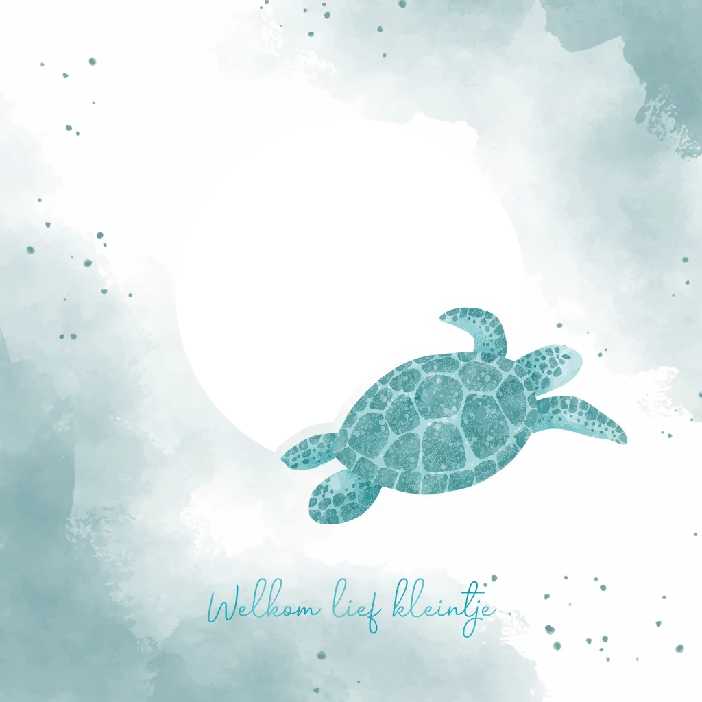 Dit geboortekaartje met een prachtige waterverf achtergrond is een betoverend ontwerp in groenblauwe tinten, met een schattige schildpad die rustig zwemt in de zee te midden van speelse bubbels. De voorkant van het kaartje biedt een doorkijkje naar de binnenkant, waar de naam en geboortedatum van jullie kleine te bewonderen zijn. De subtiele waterverfvlekken geven de kaart een dromerige uitstraling, perfect voor het aankondigen van de komst van jullie baby. Of je nu op zoek bent naar een kaartje met een maritiem thema, een lief en schattig ontwerp of gewoon een kaartje met een vleugje avontuur, dit geboortekaartje met schildpad en waterverf achtergrond past perfect bij jullie wensen. Laat dit kaartje een prachtige en memorabele aankondiging zijn van de geboorte van jullie kindje. Met zijn charmante en rustgevende uitstraling zal het zeker de harten van jullie dierbaren veroveren.